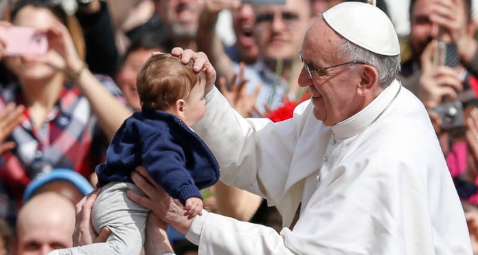 Pope Francis blesses a child in St. Peter's Square after celebrating Palm Sunday Mass at the Vatican March 24. (CNS photo/Paul Haring) (March 25, 2013) See POPE-PALM March 25, 2013.